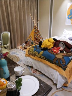 全家四大两小,主要都在小鸭亲子房活动,这个也就晚上睡觉用,双床可以推到一起,酒店床是鸭绒的很暖和,就是洗发露沐浴露一般,毛巾僵硬粗糙,不符合这个价位的酒店,酒店有免费的游泳池,温泉池,人少,孩子喜欢,儿童城堡是亲子房送的劵才能玩,沙子免费,儿童城老大不爱玩,爱玩沙子,小的什么都害怕,早餐不错。