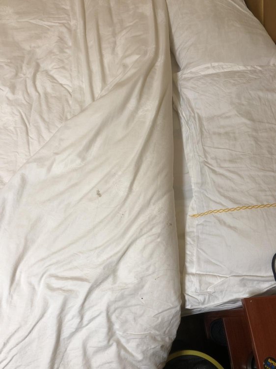 卫生,这是我们去了以后的床单,我们说,床单不干净,能不能换,老板说,刚换过了,干净了。不停强调这是新换过的,直到我提出来,我不住了,她才说可以换床单。图片有些黑印子不清楚,但是稍微有点经验的人,应该能看出来有多脏。老板说,我们这里是县城,不能跟外面比,就是洗衣机洗的。。。。意思就是床单被套也没消毒。洗手盆里还有烟灰和打开的袋的洗发水。总之各方面看都是没有收拾。而是新换的床单皱皱巴巴,黄一块黑一块,我垫着我的衣服当枕头,穿着衣服睡的。